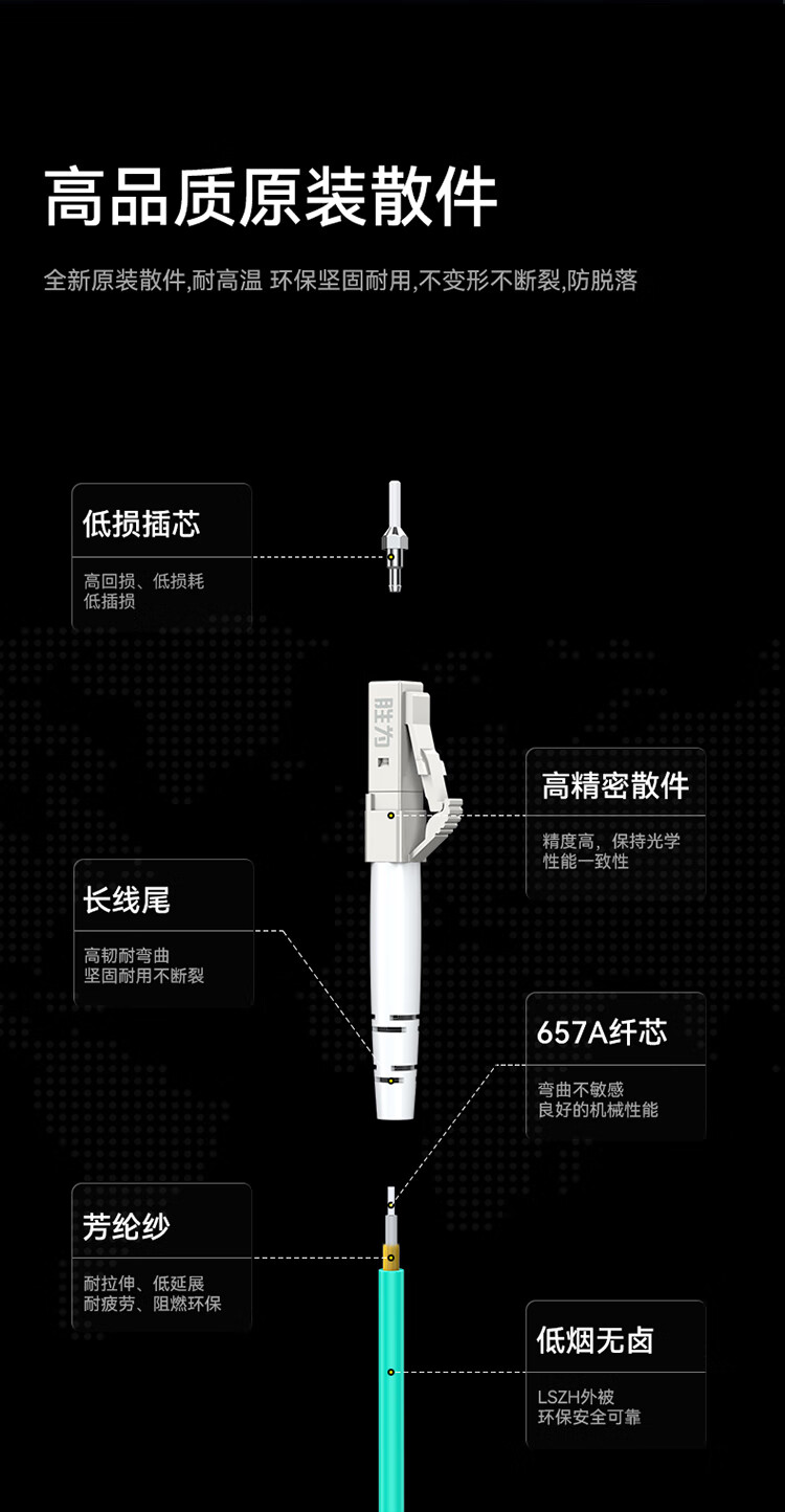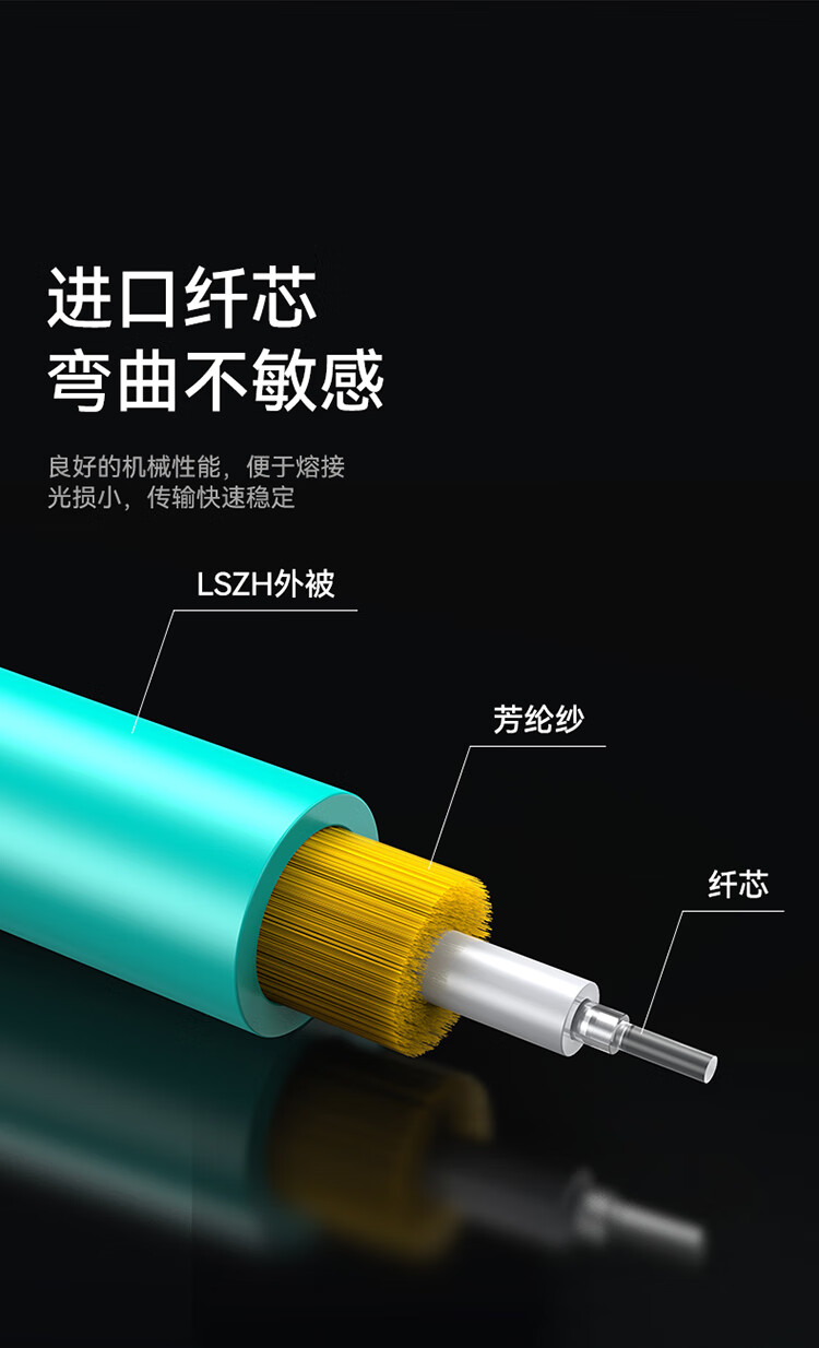 纖芯有良好的機(jī)械性能,便于熔接。光損小,傳輸快速穩(wěn)定;低煙無(wú)鹵外被,防拉抗搜性強(qiáng)低碳環(huán)保;產(chǎn)品選用全新高品質(zhì)陶瓷插芯,性能穩(wěn)定,高速可靠;廣泛應(yīng)用于通信機(jī)房及光端機(jī)和終端盒之間的連接,穩(wěn)定高速。