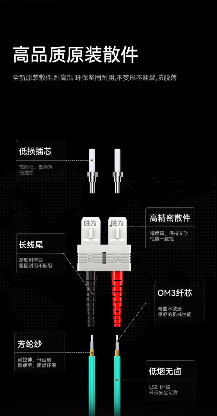 產(chǎn)品選用全新高品質(zhì)陶瓷插芯,性能穩(wěn)定高速可靠,全新低煙無鹵外被,防拉抗搜性強(qiáng),低碳環(huán)保。纖芯彎曲不敏感,原裝散件,耐高溫,環(huán)保堅(jiān)固耐用,不變形不斷裂防脫落。