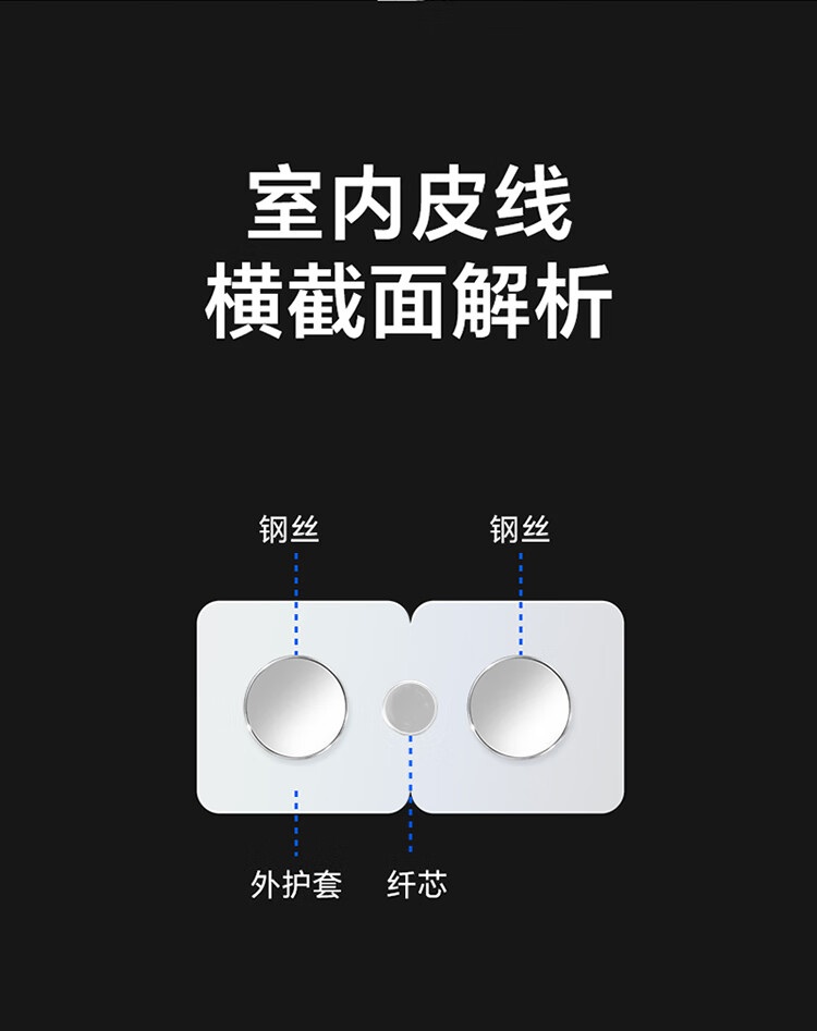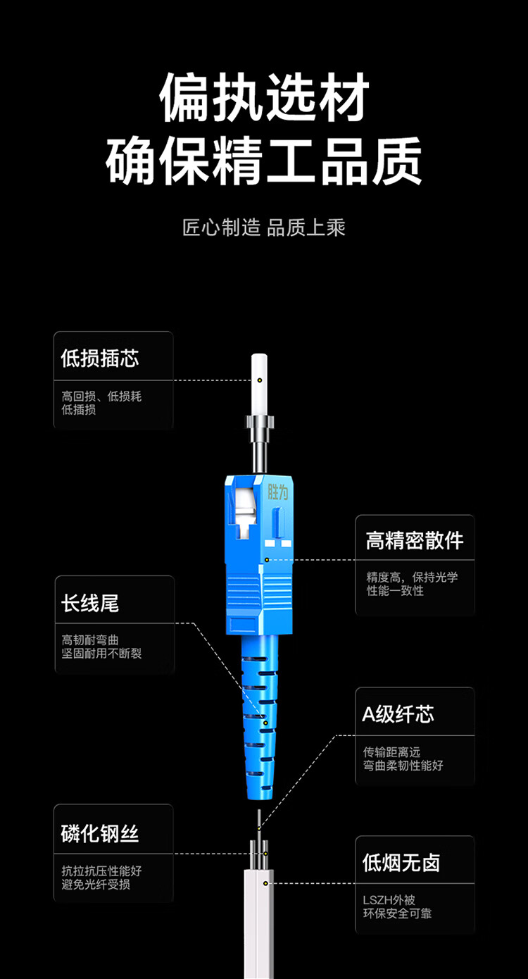高精密散件,精度高,保持光學(xué)性能一致性;長線尾,高韌耐彎曲,堅固耐用不斷裂;A級纖芯,傳輸距離遠(yuǎn),彎曲柔韌性能好;磷化鋼絲,抗拉抗壓性能好,避免光纖受損;低煙無鹵外被,使用時間長,環(huán)保安全可靠;凹型槽設(shè)計,方便易剝離,方便接續(xù),提高工作效率。
