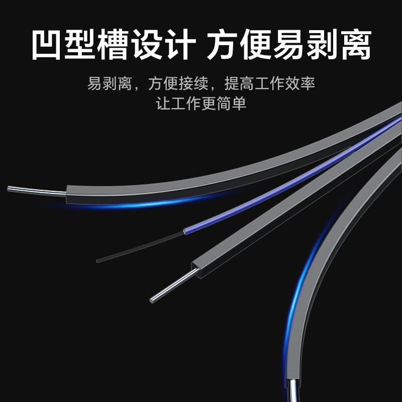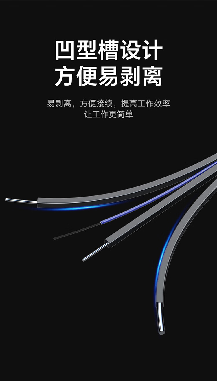 高精密散件,精度高,保持光學性能一致性;長線尾,高韌耐彎曲,堅固耐用不斷裂;A級纖芯,傳輸距離遠,彎曲柔韌性能好;磷化鋼絲,抗拉抗壓性能好,避免光纖受損;低煙無鹵外被,使用時間長,環(huán)保安全可靠;凹型槽設計,方便易剝離,方便接續(xù),提高工作效率。