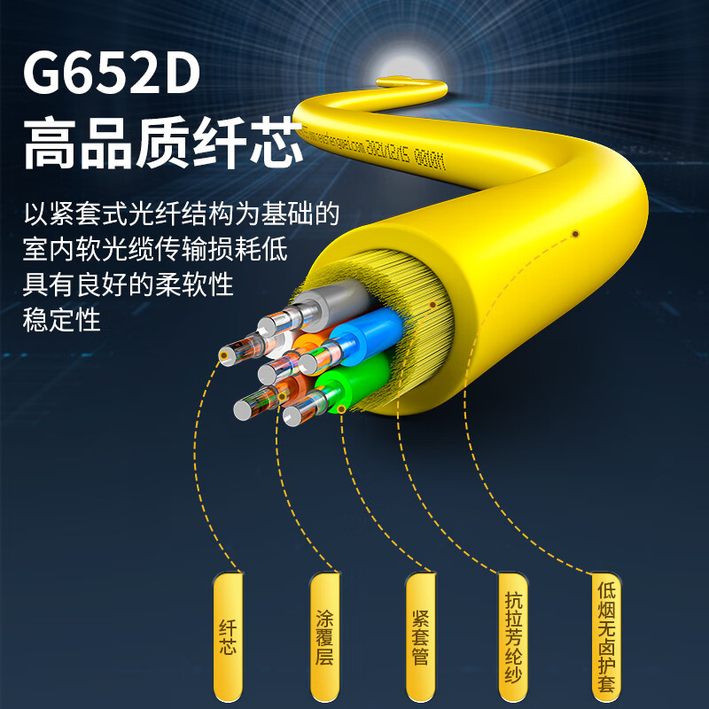 G652D高品質(zhì)纖芯,以緊套式光纖結構為基礎的室內(nèi)軟光纜,傳輸損耗低,具有良好的柔軟性、穩(wěn)定性。剝離性能優(yōu)越,簡單開剝光纜,彎曲直徑小,可自由熔接抗拉伸。光纜抗拉性、扭曲性、抗彎性好,能在緊湊型的空間中安裝。環(huán)保低煙無鹵外被為光纜提供了阻燃性能,環(huán)保安全,保密性能好,可用于特殊環(huán)境。