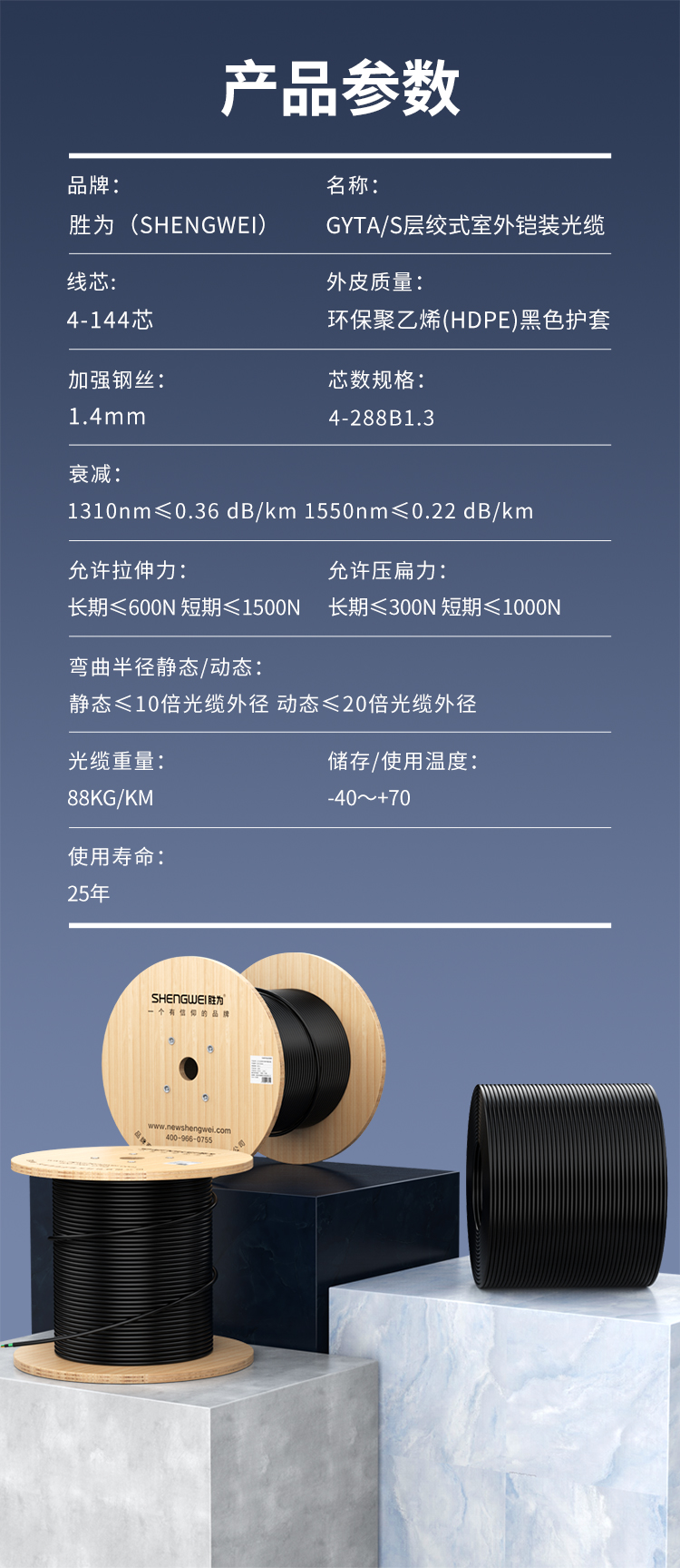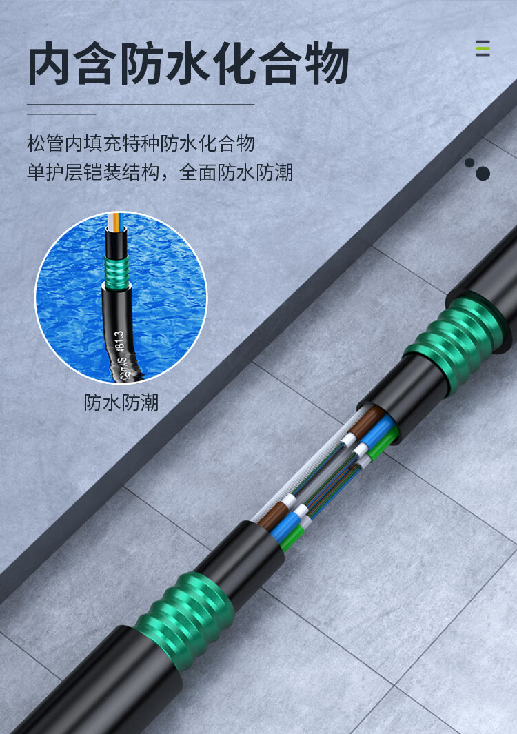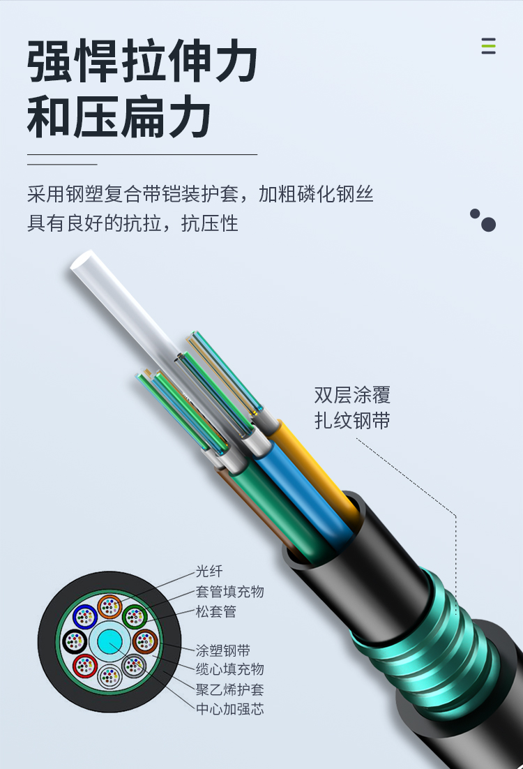 采用環(huán)保聚乙烯 (HDPE)黑色外被,添加UV防曬材料,耐高低溫,不易老化。高品質(zhì)線芯不易斷損耗低,采用高品質(zhì)纖芯, 損耗低穩(wěn)定抗干擾, 傳輸更快。足芯足米應用廣泛,滿足不同環(huán)境的工作需求。強悍拉伸力和壓扁力,采用鋼塑復合帶鎧裝護套, 加粗磷化鋼絲具有良好的抗拉, 抗壓性。