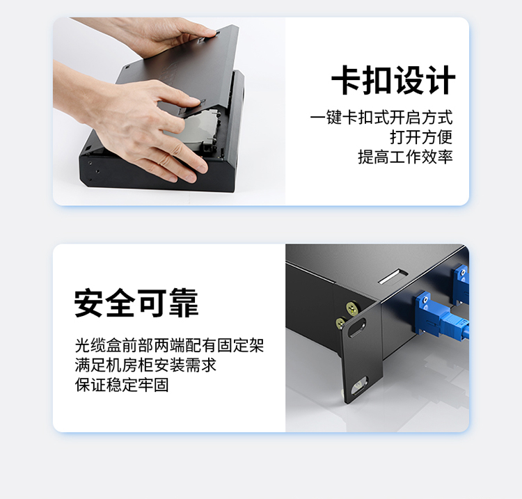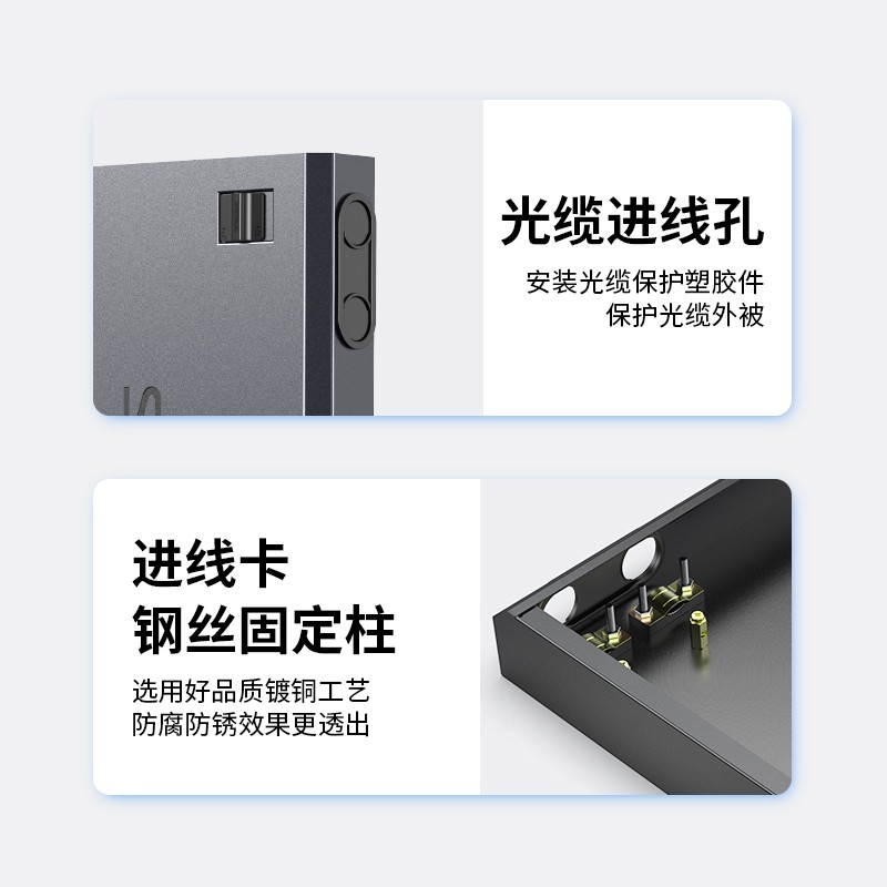 加厚加強冷軋板材質, 抗壓耐沖擊持久使用不變形, 承重力強。采用黑色環(huán)氧靜電噴塑烤漆工藝, 高度耐磨耐腐蝕不沾指紋, 質感好。采用低損配件, 減少信號傳輸損耗;卡扣和螺絲采用內凹設計, 堆疊平穩(wěn), 節(jié)省空間;安裝快捷,掛孔設計;熔接盤內部結構堅固緊密, 安裝光纜/光纖條理分配盤纖與固定, 有效保護光纖不受損傷以及控制彎曲半徑保證信號穩(wěn)定傳輸。