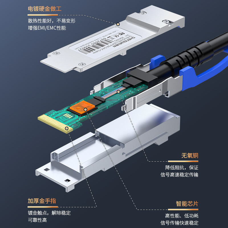 高速傳輸速率,兼容廣泛,高速直聯(lián)低功耗,沒有光電轉(zhuǎn)換,節(jié)能環(huán)保;耐高溫,散熱好;短距離直連,節(jié)省成本。