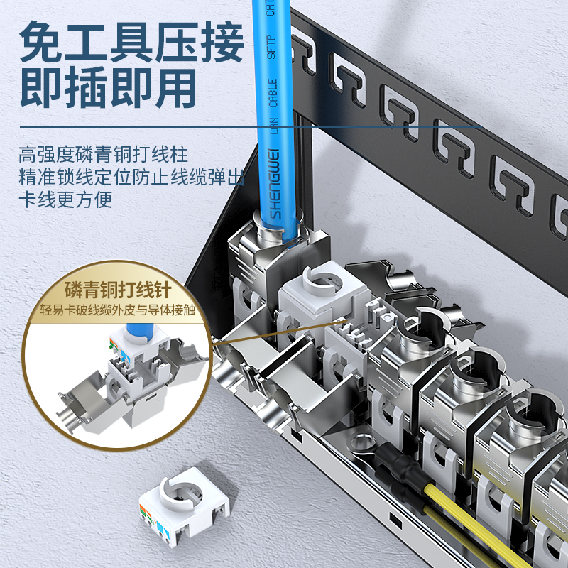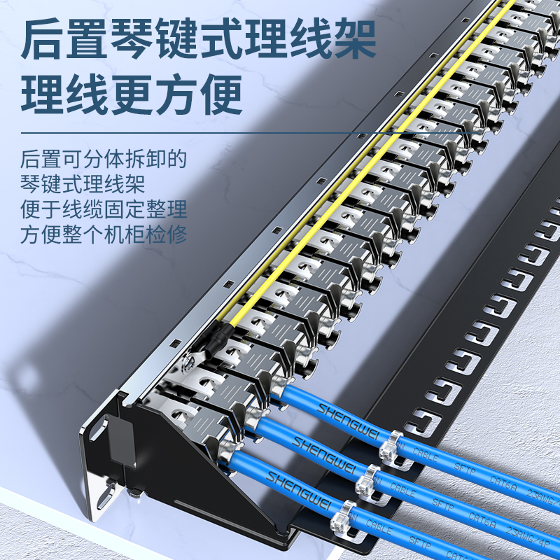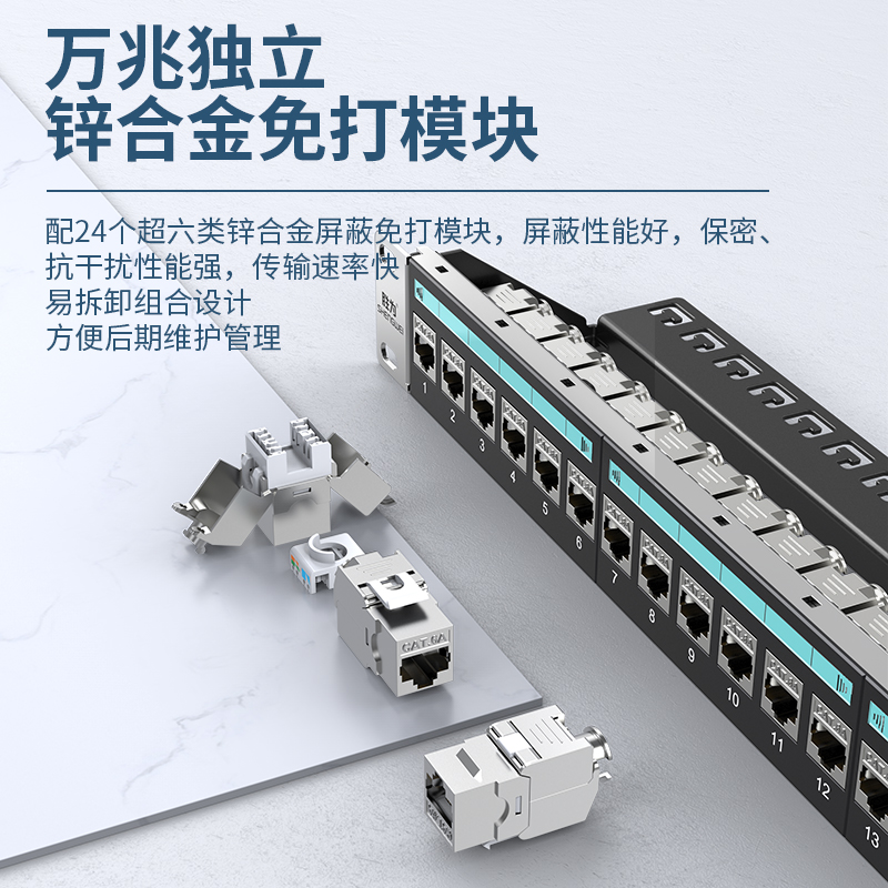萬(wàn)兆工程級(jí)超六類(lèi)配線架,鋅合金全屏蔽免打模塊,標(biāo)準(zhǔn)的1U高度和19英寸安裝結(jié)構(gòu),適用19英寸網(wǎng)絡(luò)機(jī)柜,配24個(gè)超六類(lèi)鋅合金屏蔽免打模塊,屏蔽性能好,保密、抗干擾性能強(qiáng),傳輸速率快,易拆卸組合設(shè)計(jì),方便后期維護(hù)管理。