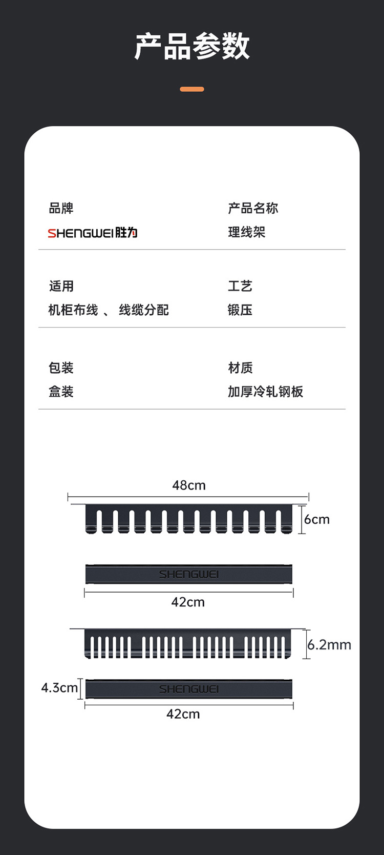 工程加厚理線架,適用于19英寸標(biāo)準(zhǔn)機(jī)柜,加厚冷軋鋼架,采用加厚冷軋板打造高強(qiáng)硬度保護(hù)線纜,理線更方便、更整潔。