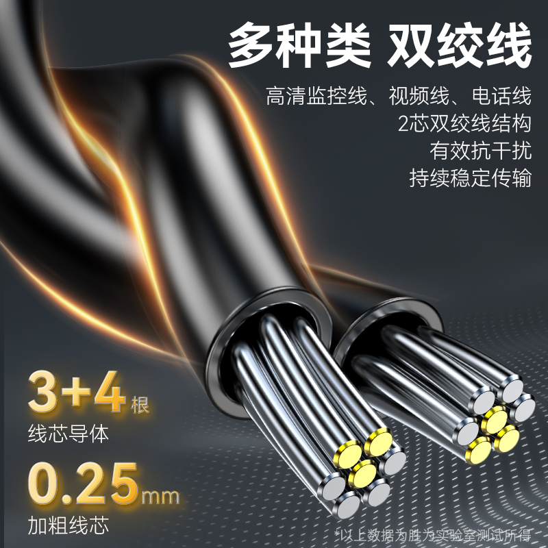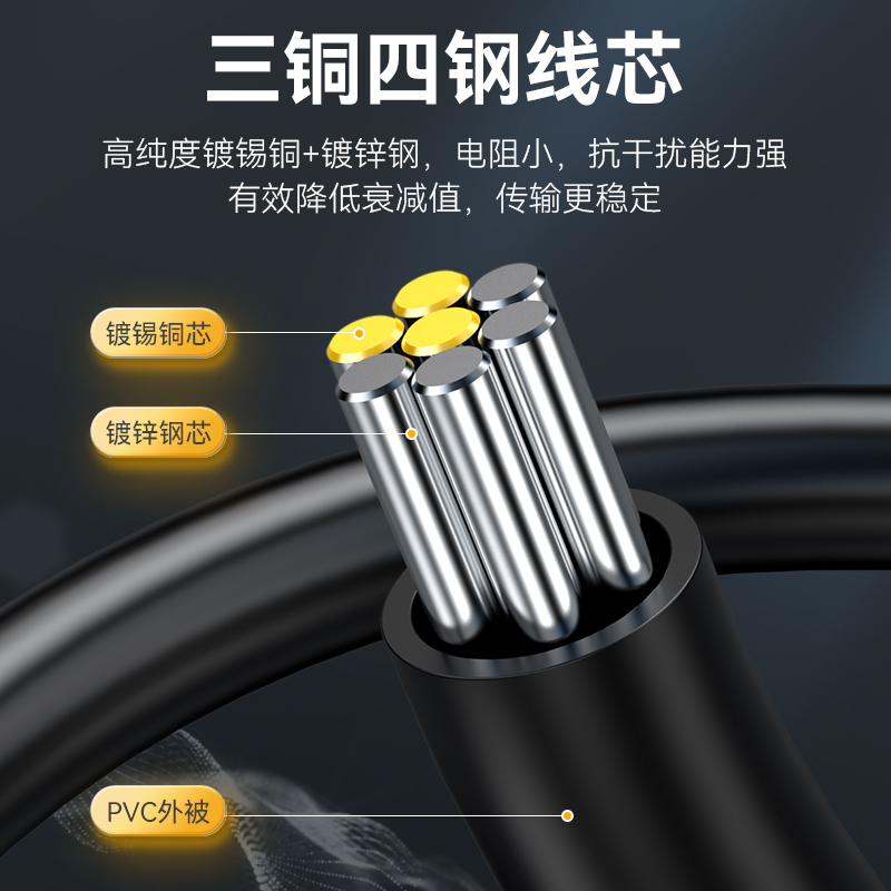 高純度鍍錫銅+鍍鋅鋼,電阻小,2芯雙絞結構,抗干擾能力強,有效降低衰減值,傳輸更穩(wěn)定;環(huán)保護套防水防潮,阻燃性好、耐高低溫,可將線材直接打結系到某固定物上,柔軟易彎折。百米架空跨距無需使用鋼絲等輔助材料,直接拉拽,強韌不易斷