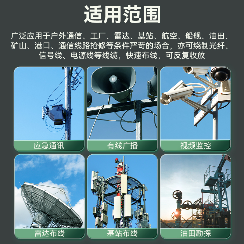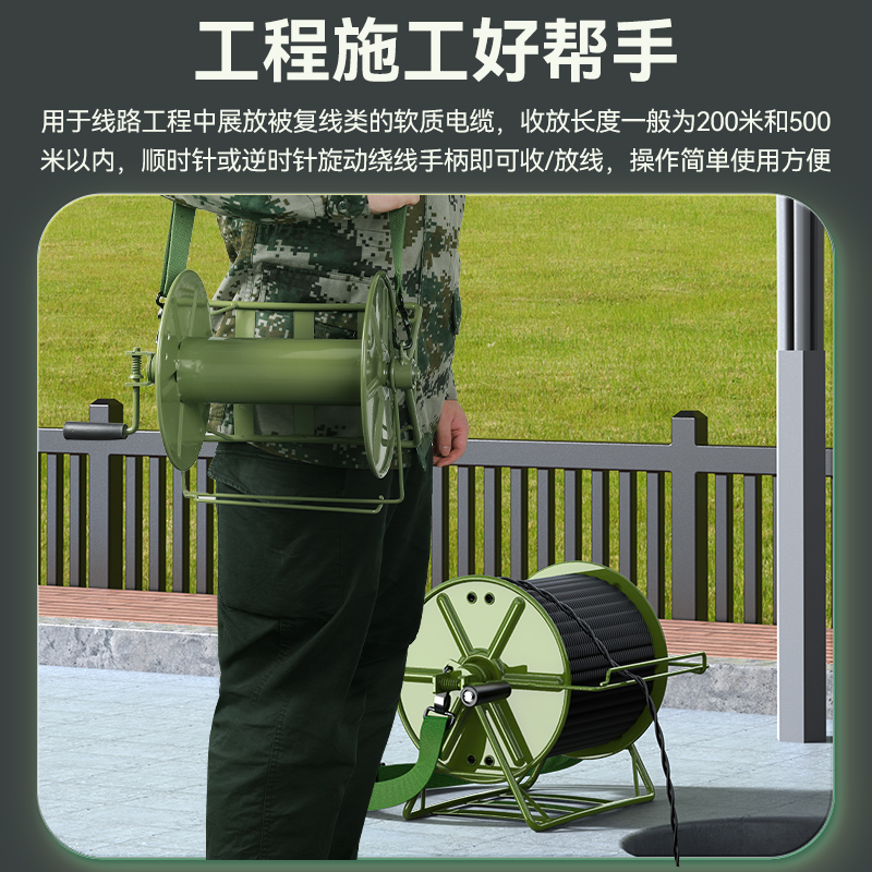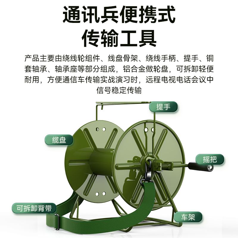 多功能被復(fù)線絡(luò)車,野外應(yīng)急,便捷通訊。用于線路工程中展放被復(fù)線類的軟質(zhì)電纜,收放長度一般為200米和500米以內(nèi),順時針或逆時針旋動繞線手柄即可收/放線,操作簡單使用方便??刹鹦遁p便耐用,方便通信車傳輸實(shí)戰(zhàn)演習(xí)時,遠(yuǎn)程電視電話會議中信號穩(wěn)定傳輸。放線盤可以快速拆裝,以利于更換線纜。