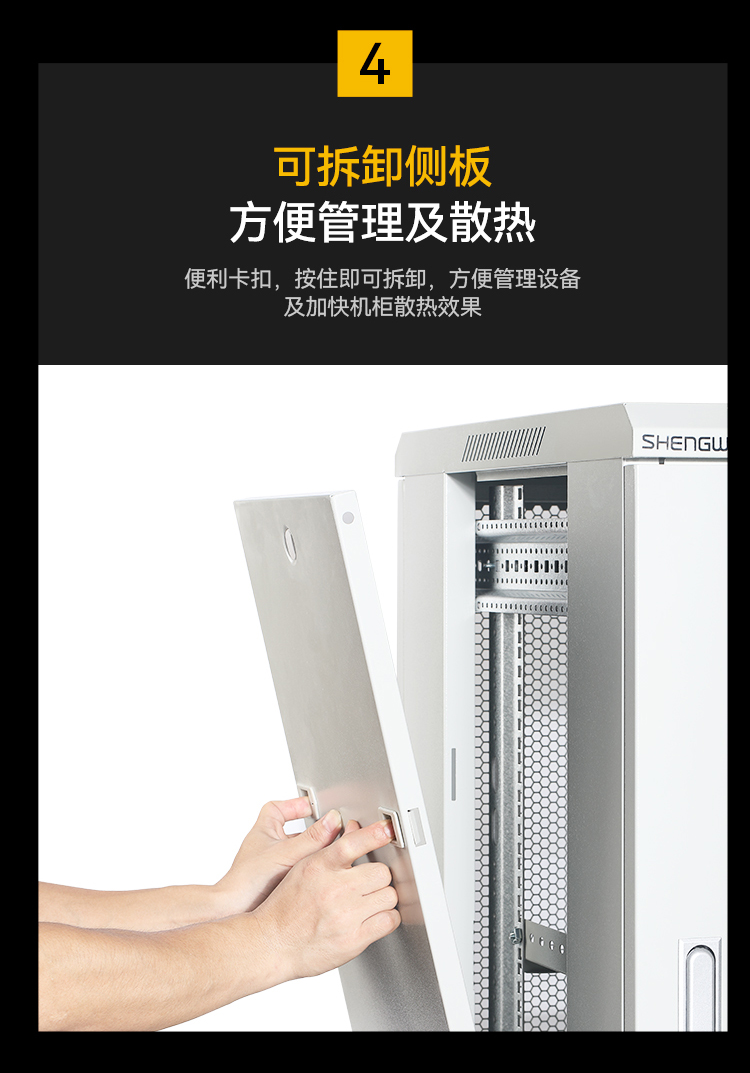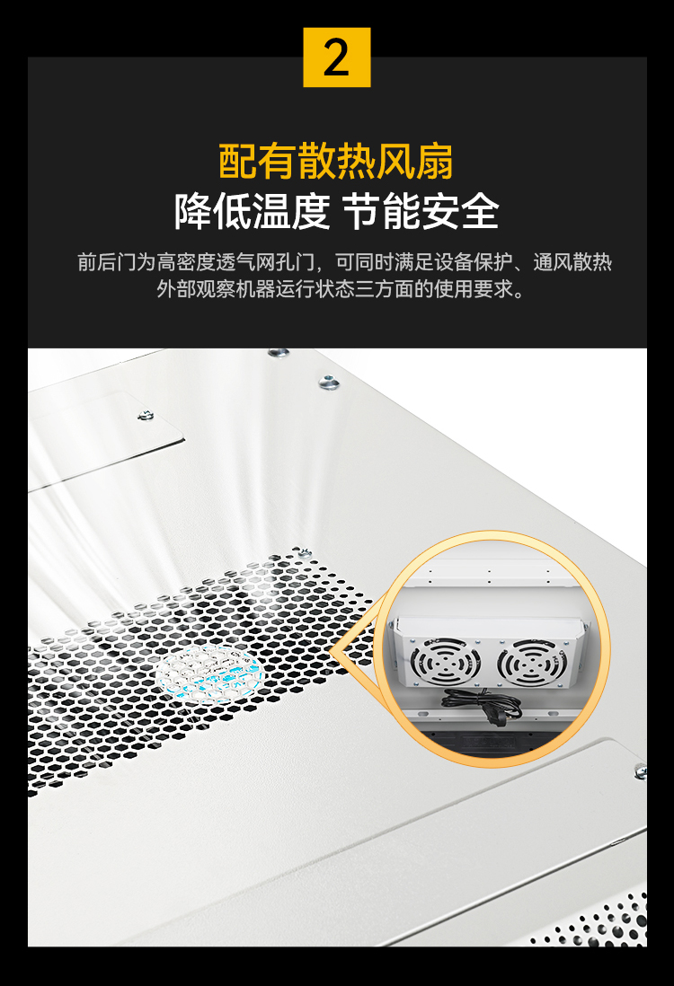 配有散熱風扇,降低溫度節(jié)能安全,前后門為高密度透氣網孔門,可同時滿足設備保護、通風散熱,外部觀察機器運行狀態(tài)三方面的使用要求。