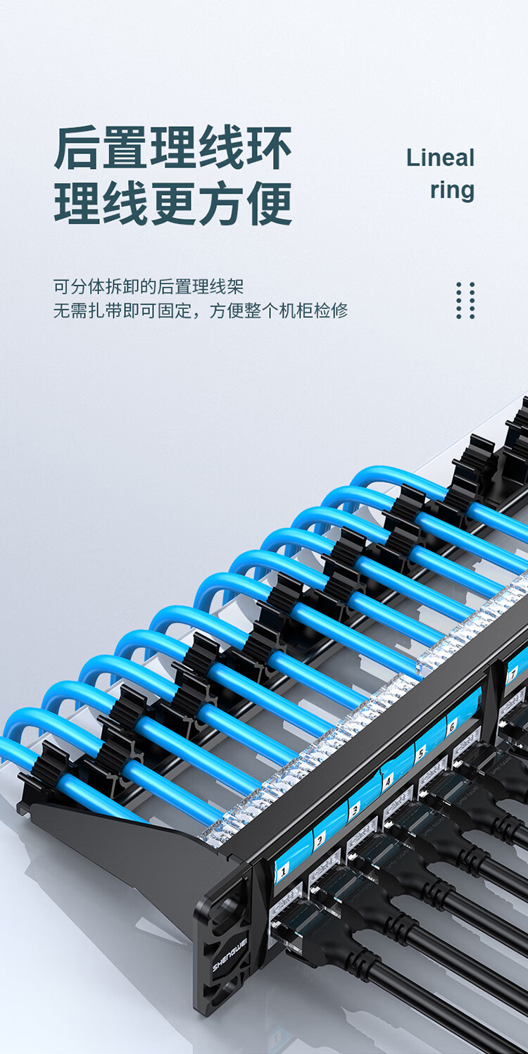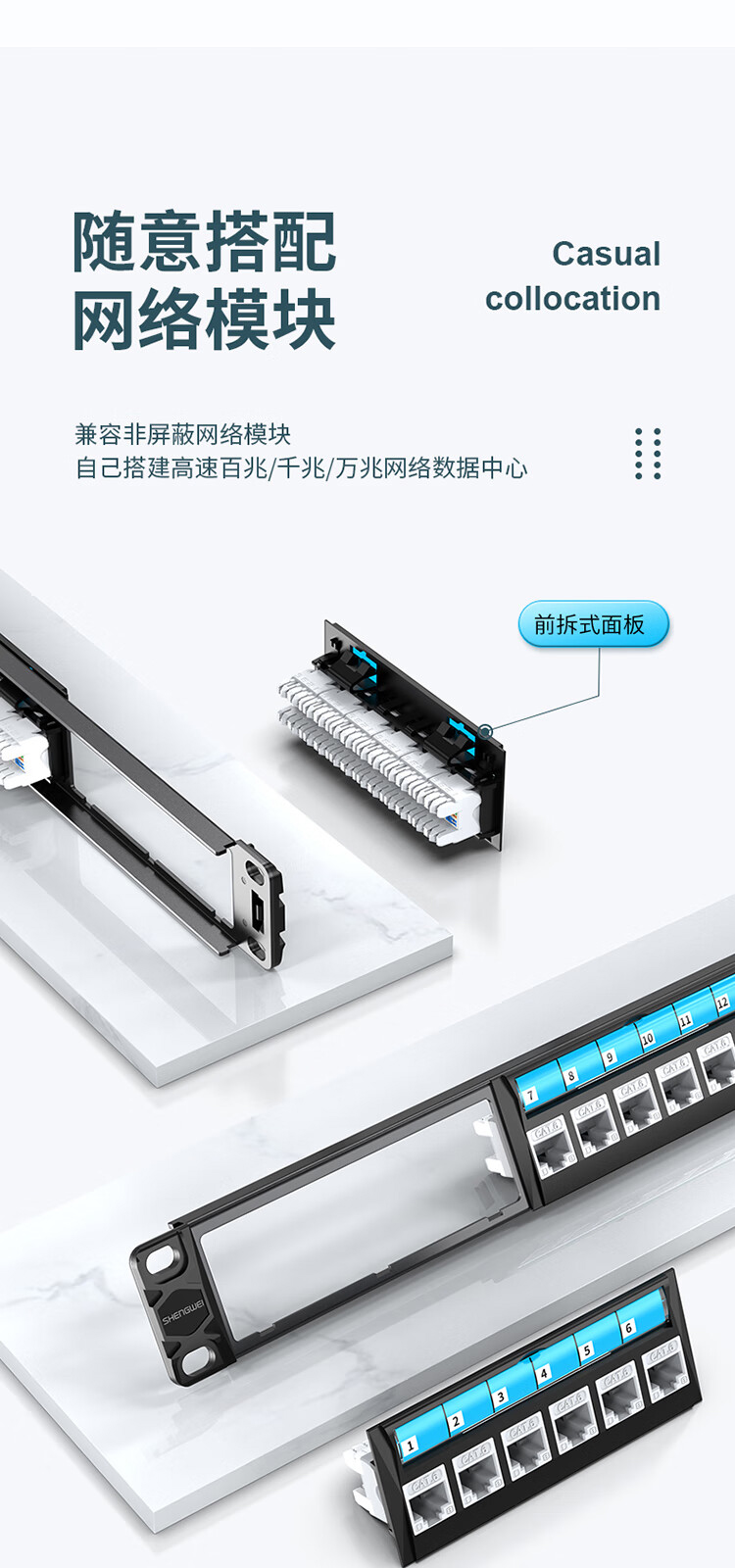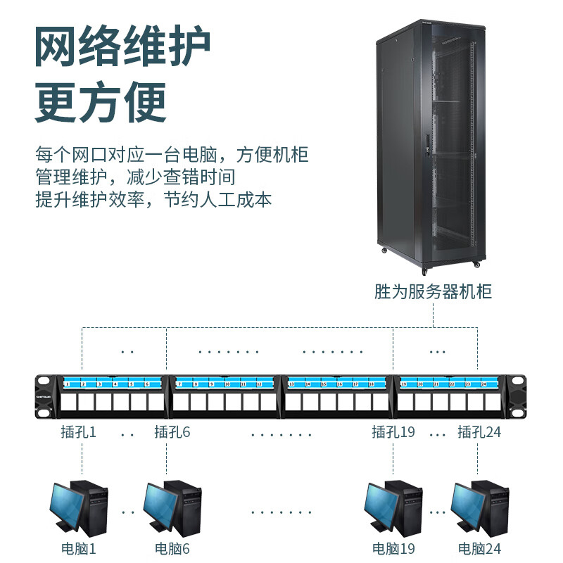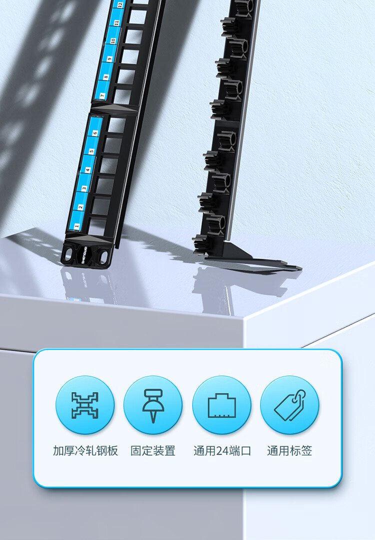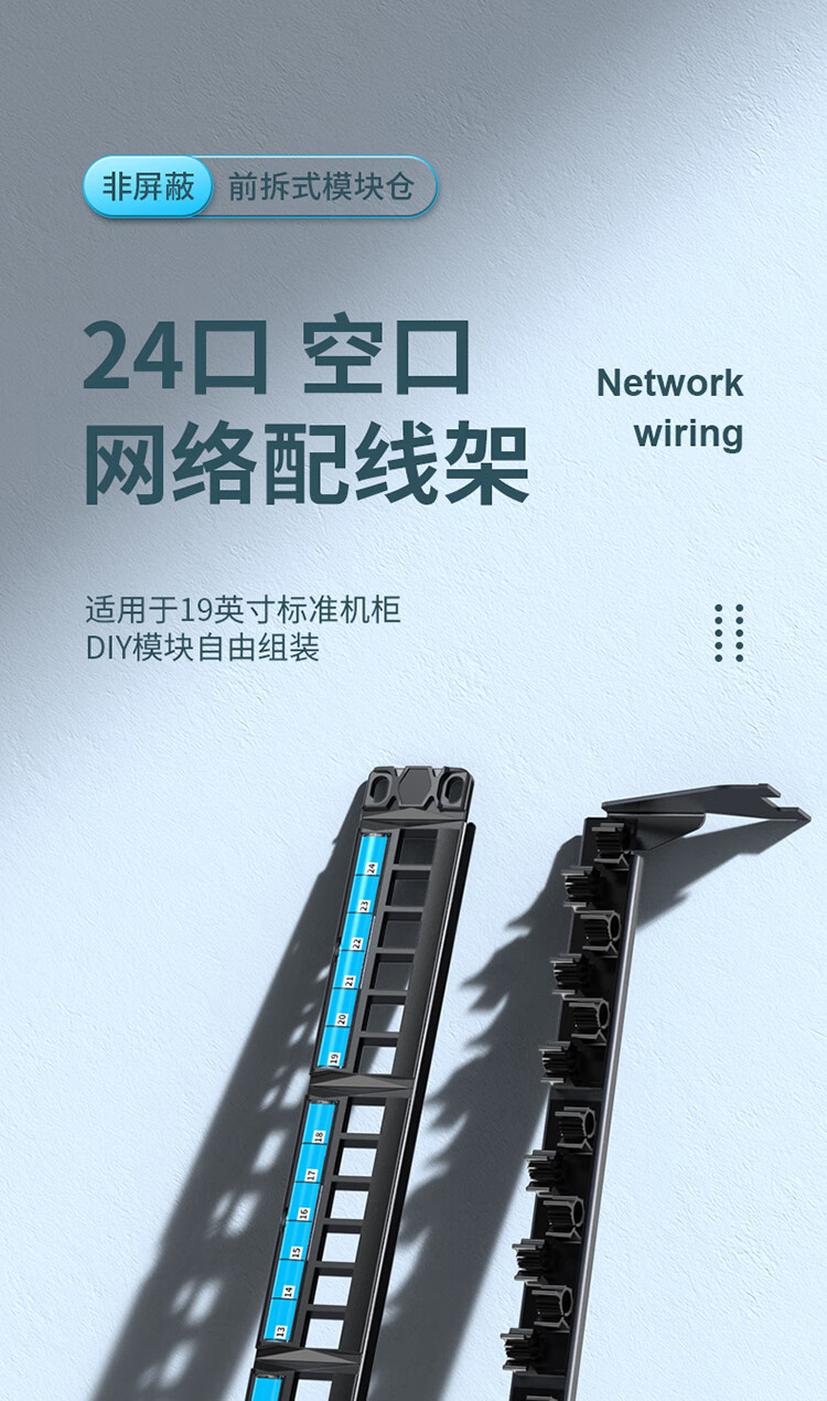 24口空口網(wǎng)絡(luò)配線架,適用于19英寸標(biāo)準(zhǔn)機(jī)柜,DIY模塊自由組裝,非屏蔽前拆式,加厚冷軋鋼板,固定裝置,通用24端口,通用標(biāo)簽,使用方便。