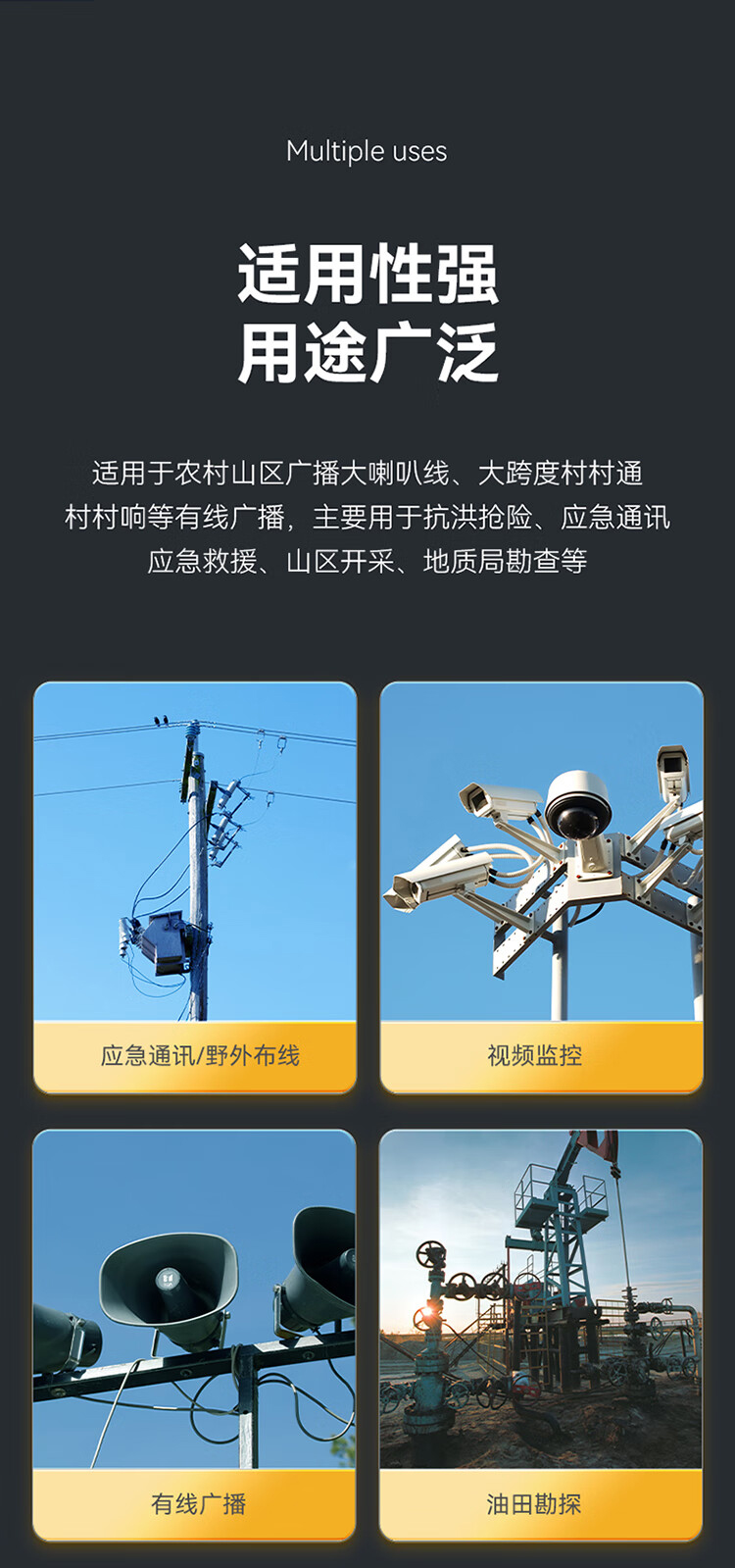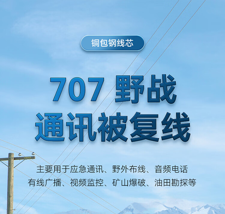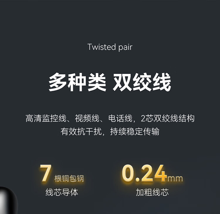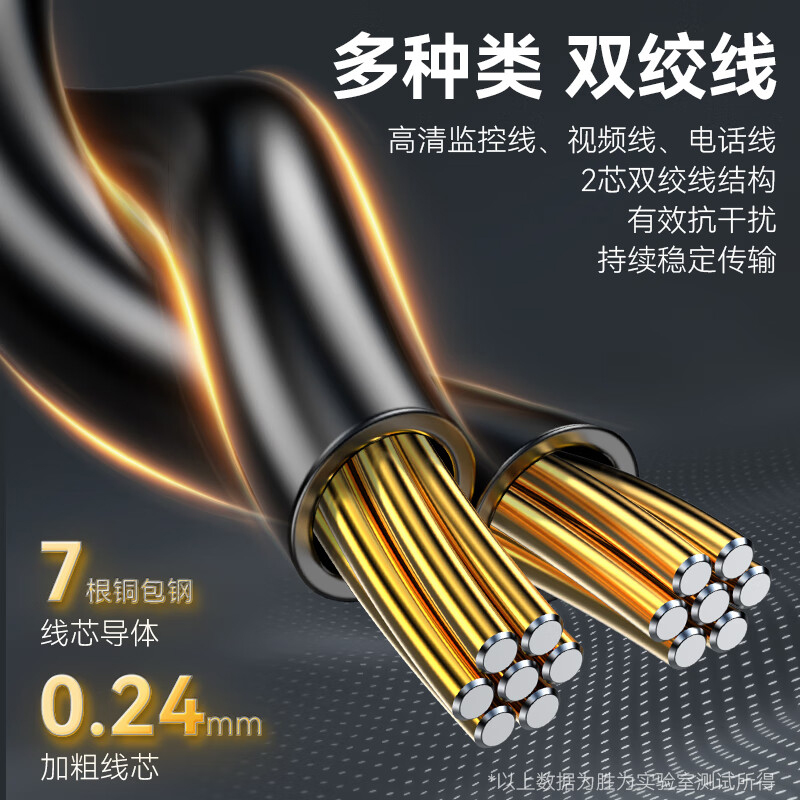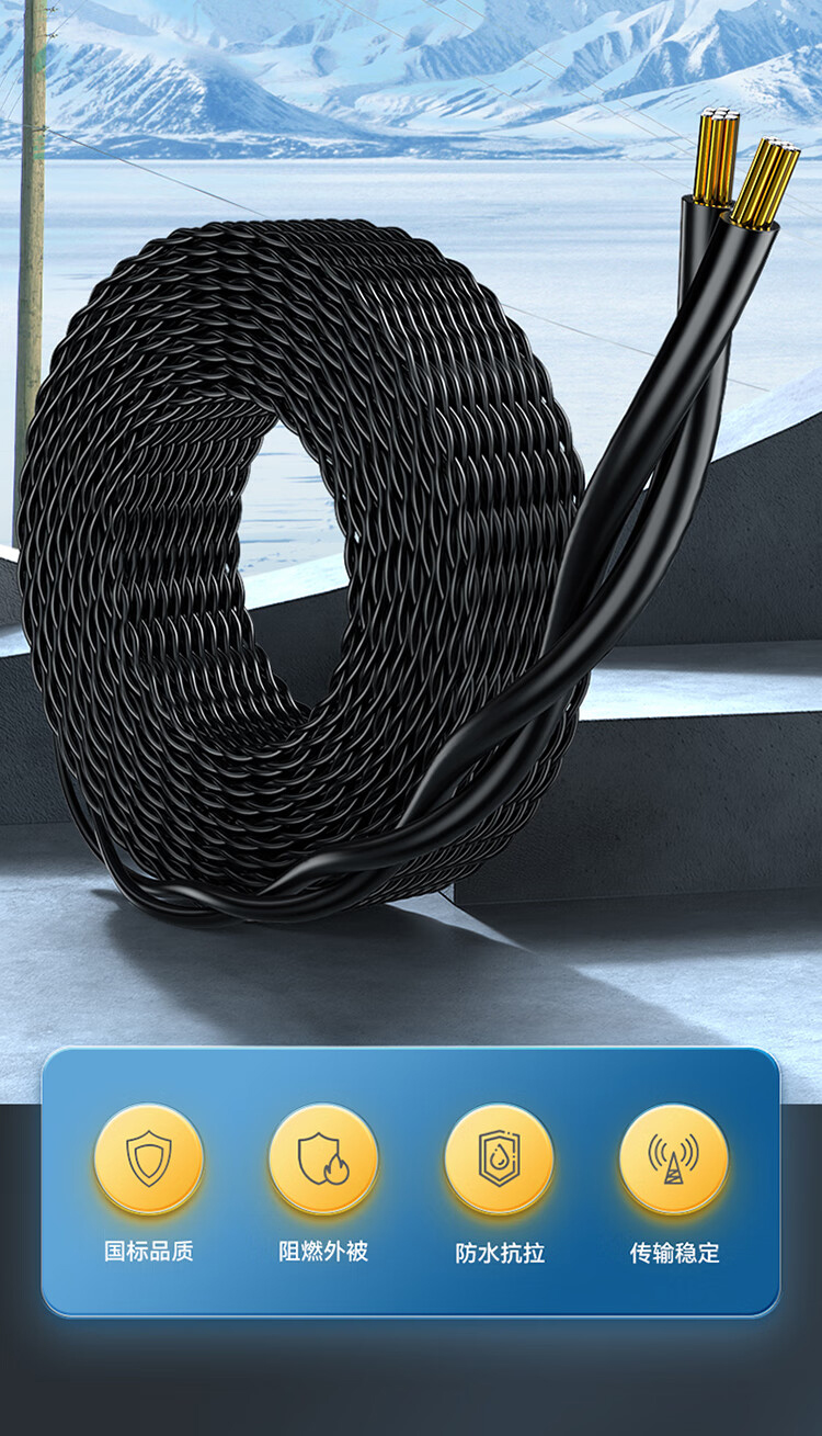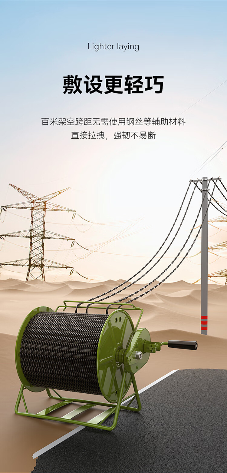銅包鋼線芯,2芯雙絞結(jié)構(gòu),抗干擾能力強(qiáng),與強(qiáng)電同走不易出現(xiàn)干擾的情況,傳輸更穩(wěn)定;環(huán)保護(hù)套防水防潮,阻燃性好、耐高低溫,可將線材直接打結(jié)系到某固定物上,柔軟易彎折。百米架空跨距無需使用鋼絲等輔助材料,直接拉拽,強(qiáng)韌不易斷。