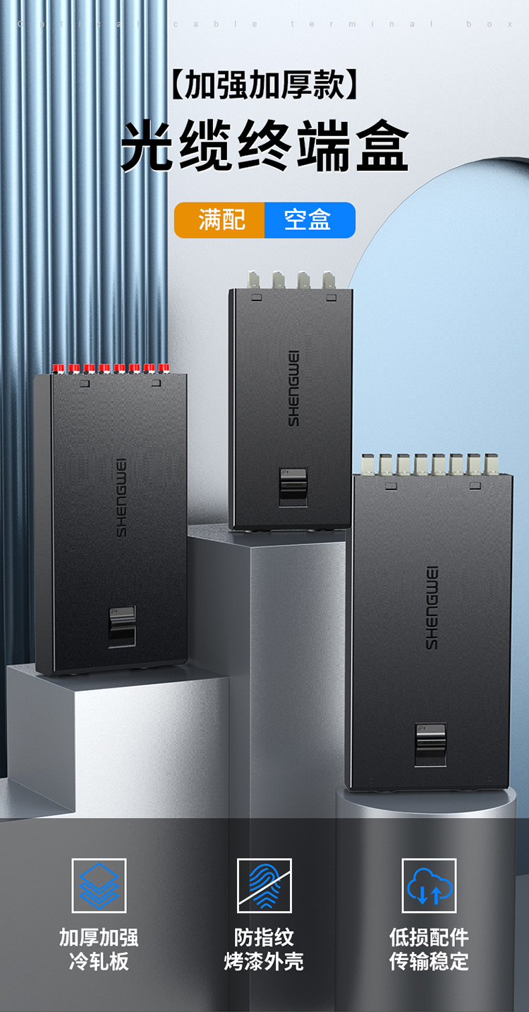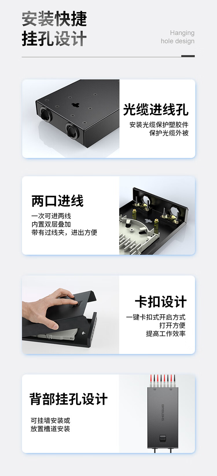加厚加強(qiáng)冷軋板材質(zhì), 抗壓耐沖擊持久使用不變形, 承重力強(qiáng)。采用黑色環(huán)氧靜電噴塑烤漆工藝, 高度耐磨耐腐蝕不沾指紋, 質(zhì)感好。采用低損配件, 減少信號(hào)傳輸損耗;卡扣和螺絲采用內(nèi)凹設(shè)計(jì), 堆疊平穩(wěn), 節(jié)省空間;安裝快捷,掛孔設(shè)計(jì);熔接盤(pán)內(nèi)部結(jié)構(gòu)堅(jiān)固緊密, 安裝光纜/光纖條理分配盤(pán)纖與固定, 有效保護(hù)光纖不受損傷以及控制彎曲半徑保證信號(hào)穩(wěn)定傳輸。