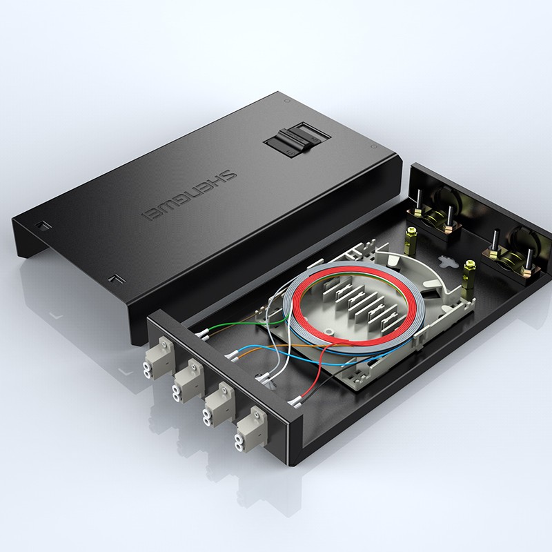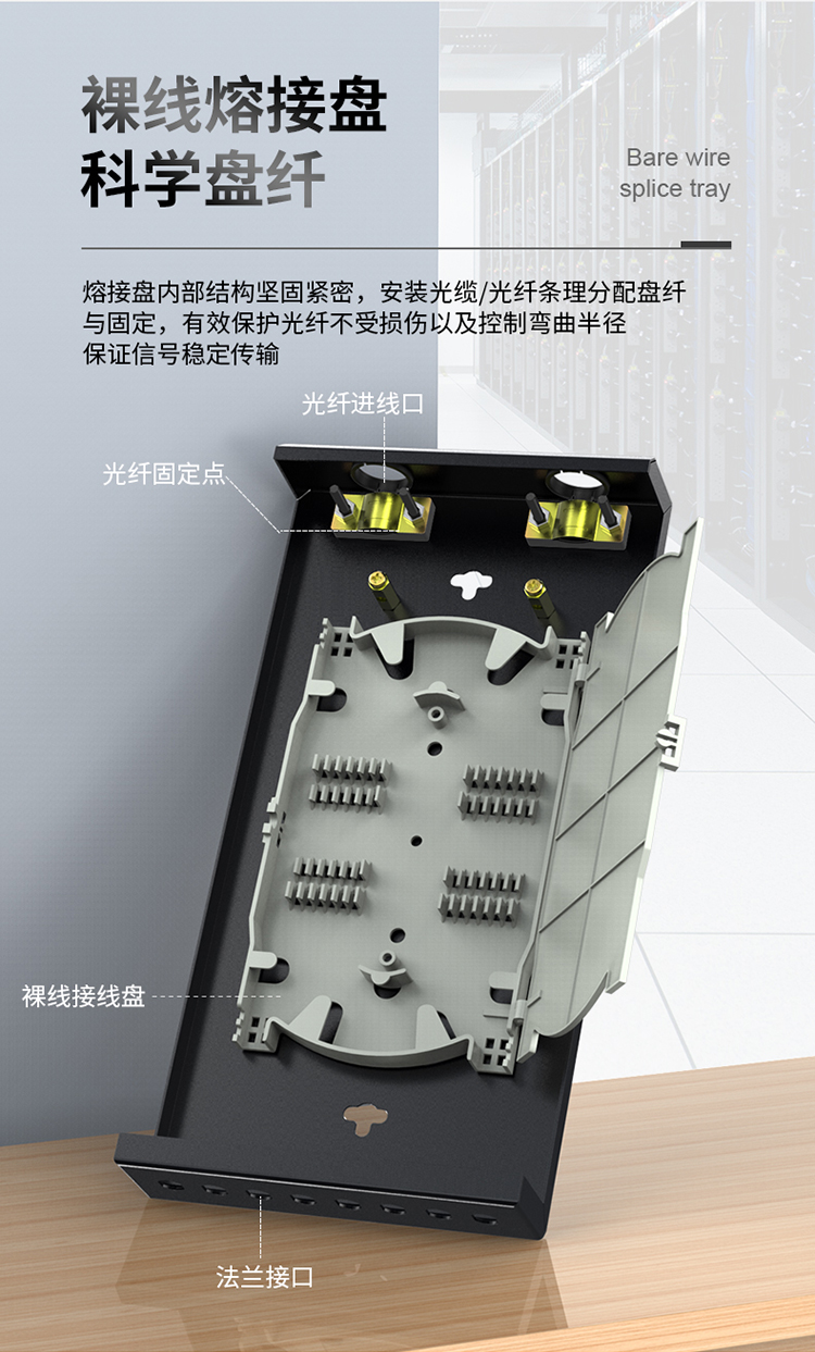 加厚加強冷軋板材質(zhì), 抗壓耐沖擊持久使用不變形, 承重力強。采用黑色環(huán)氧靜電噴塑烤漆工藝, 高度耐磨耐腐蝕不沾指紋, 質(zhì)感好。采用低損配件, 減少信號傳輸損耗;卡扣和螺絲采用內(nèi)凹設(shè)計, 堆疊平穩(wěn), 節(jié)省空間;安裝快捷,掛孔設(shè)計;熔接盤內(nèi)部結(jié)構(gòu)堅固緊密, 安裝光纜/光纖條理分配盤纖與固定, 有效保護光纖不受損傷以及控制彎曲半徑保證信號穩(wěn)定傳輸。