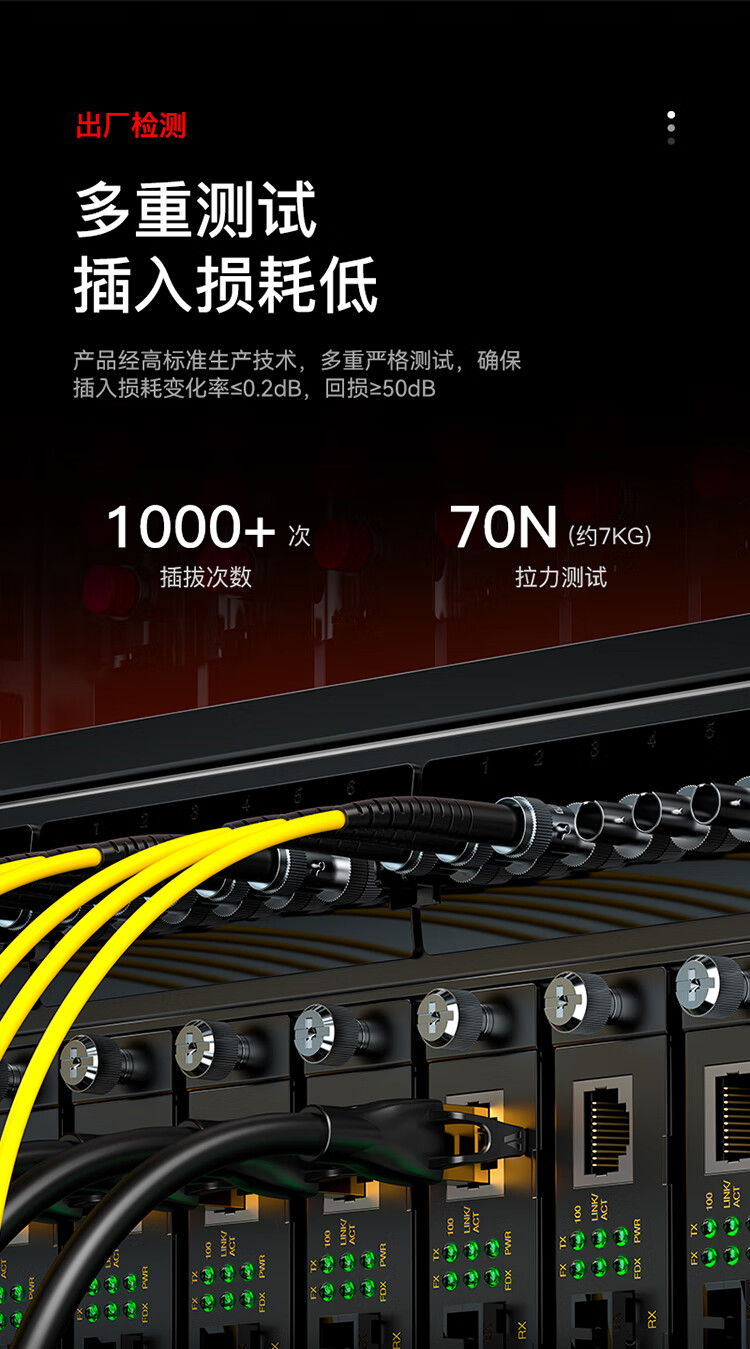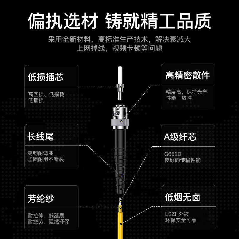 長(zhǎng)線尾保護(hù),堅(jiān)固耐用不斷裂;采用全新高品質(zhì)陶瓷插芯,數(shù)據(jù)互換性穩(wěn)定;耐插拔次數(shù)高,性能穩(wěn)定可靠;纖芯彎曲不敏感,良好的機(jī)械性能,便于熔接光損小,傳輸快速穩(wěn)定;環(huán)保低煙無(wú)鹵材質(zhì)外被,使用時(shí)間長(zhǎng),耐磨損抗腐蝕,環(huán)保無(wú)異味;多重測(cè)試,插入損耗低,產(chǎn)品經(jīng)高標(biāo)準(zhǔn)生產(chǎn)技術(shù),多重嚴(yán)格測(cè)試,確保插入損耗變化率<0.30dB,回?fù)p≥50dB。