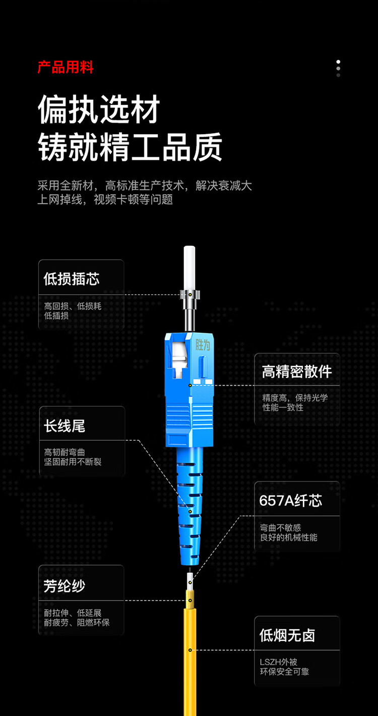 耐插拔次數(shù)高,性能穩(wěn)定可靠;纖芯彎曲不敏感,良好的機(jī)械性能,便于熔接光損小,傳輸快速穩(wěn)定;環(huán)保低煙無鹵材質(zhì)外被,使用時(shí)間長,耐磨損抗腐蝕,環(huán)保無異味;多重測(cè)試,