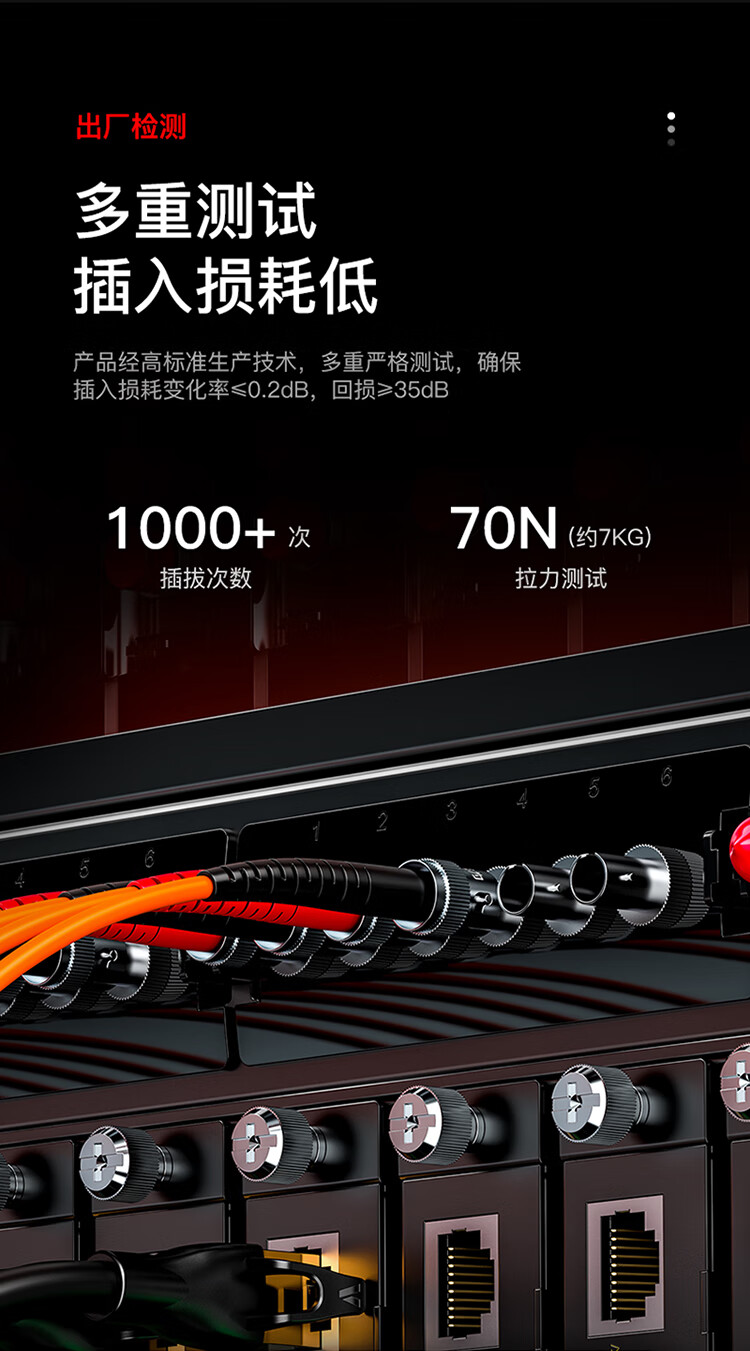 一體工藝,長線尾保護(hù),堅(jiān)固耐用不斷裂;采用高品質(zhì)陶瓷插芯,數(shù)據(jù)互換性穩(wěn)定,耐插拔次數(shù)高,性能穩(wěn)定可靠;纖芯彎曲不敏感,良好的機(jī)械性能,便于熔接光損小,傳輸快速穩(wěn)定;環(huán)保低煙無鹵材質(zhì)外被,使用時(shí)間長,耐磨損抗腐蝕,環(huán)保無異味;多重測(cè)試,插入損耗低,產(chǎn)品經(jīng)高標(biāo)準(zhǔn)生產(chǎn)技術(shù),多重嚴(yán)格測(cè)試,確保插入損耗變化率<0.30dB,回?fù)p≥35dB