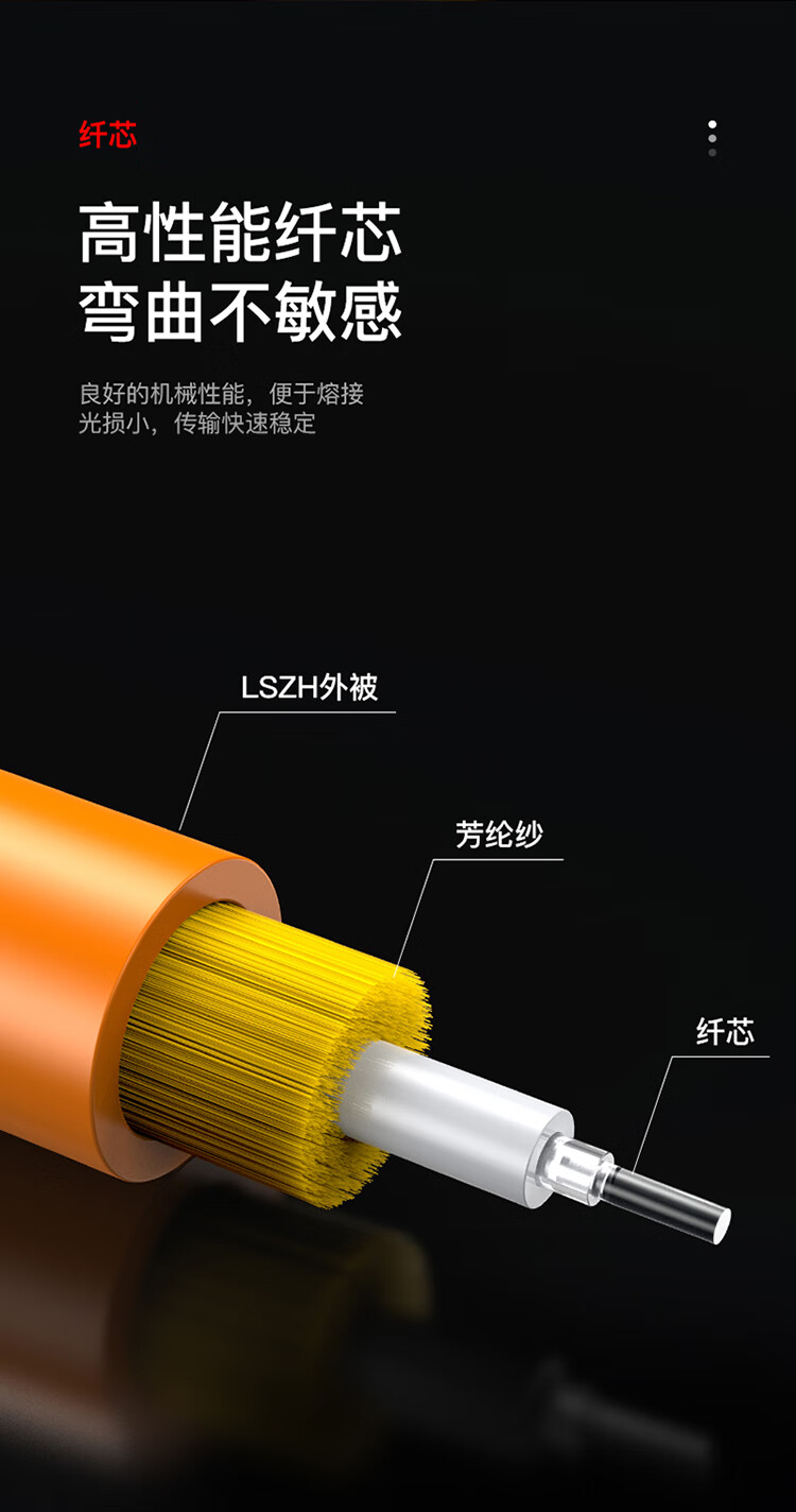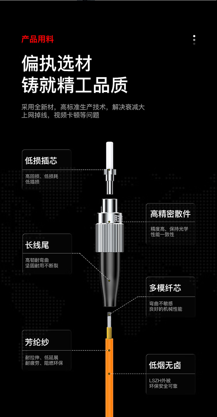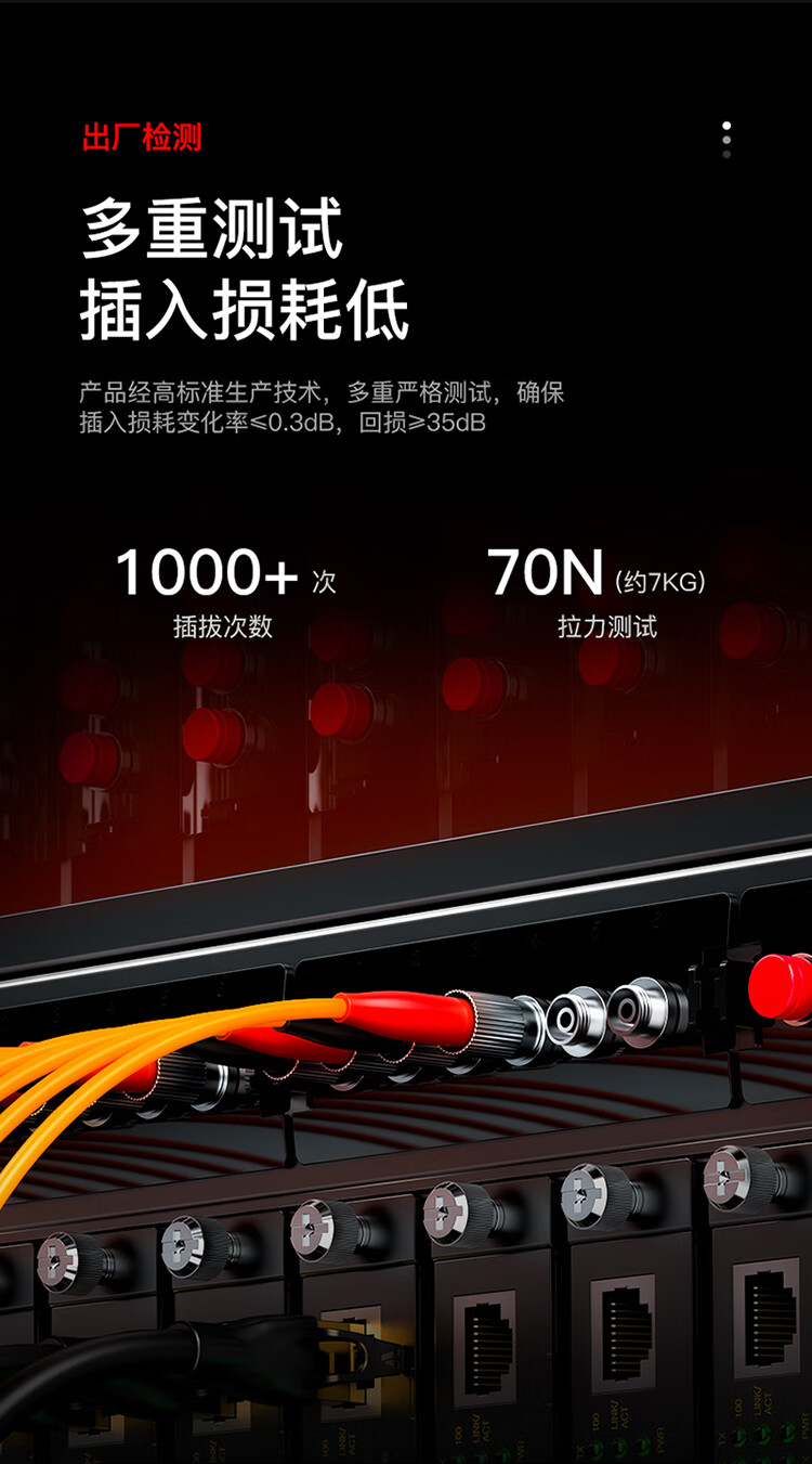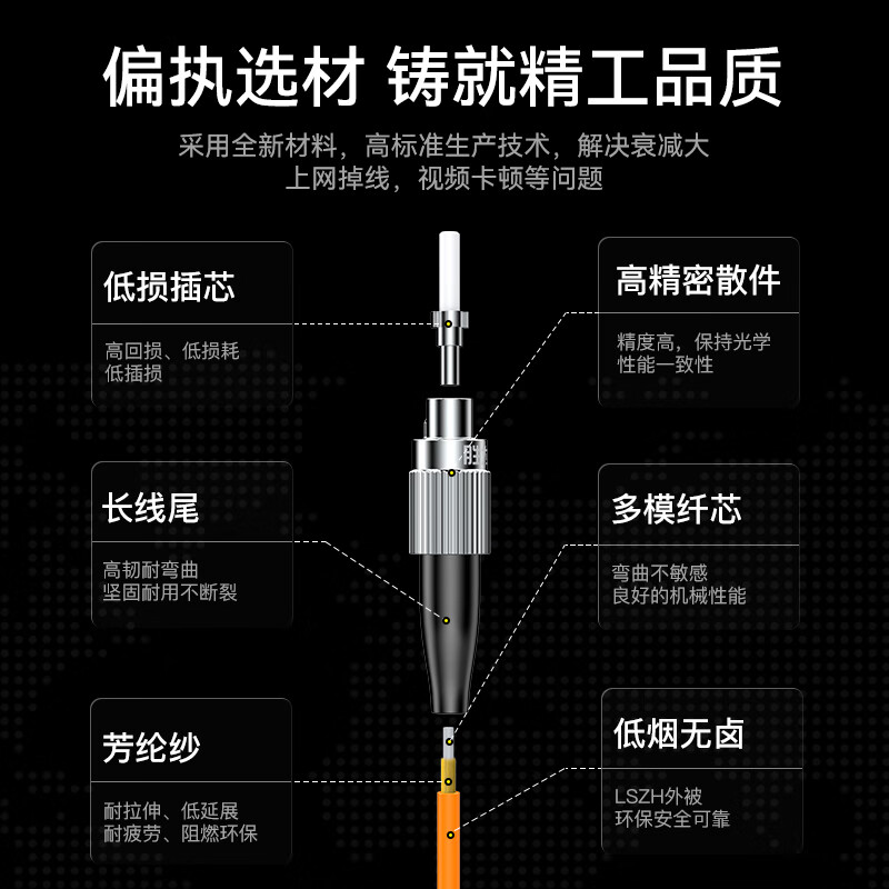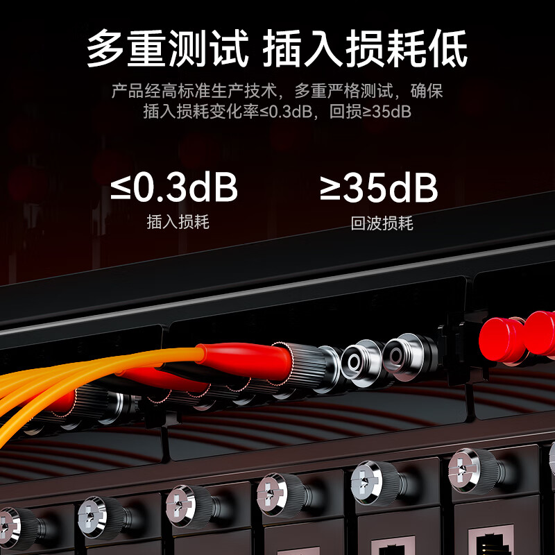 一體工藝,長線尾保護,堅固耐用不斷裂;采用高品質(zhì)陶瓷插芯,數(shù)據(jù)互換性穩(wěn)定,耐插拔次數(shù)高,性能穩(wěn)定可靠;纖芯彎曲不敏感,良好的機械性能,便于熔接光損小,傳輸快速穩(wěn)定;環(huán)保低煙無鹵材質(zhì)外被,使用時間長,耐磨損抗腐蝕,環(huán)保無異味;多重測試,插入損耗低,產(chǎn)品經(jīng)高標準生產(chǎn)技術(shù),多重嚴格測試,確保插入損耗變化率<0.30dB,回損≥35dB